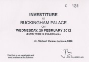 I am very grateful to you for explaining the whole procedure and this helps me greatly in looking forward to my own investiture of MBE on the 23rd October 2013. Through your information, I have been able to explain everything to my wife, daughter and son-in-law who will all be my guests at Buckingham Palace.