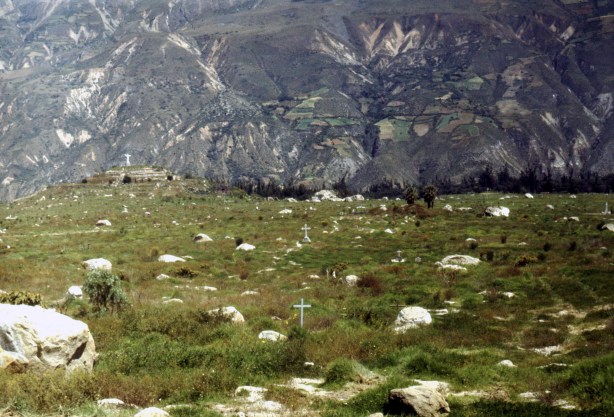 This fell from near the summit of Nevado Huascarán, Peru’s highest mountain. I read that more than 80 million cubic meters of rock and ice fell at a speed of more than 250 kph. Click on the photo to the left to see the path of the landslide. The towns of Yungay and Ranrahirca were in the path of this landslide, known in Peru as a huayco, and were totally destroyed. In Yungay, just a few palm trees were left standing, and the statue of Christ in the cemetery, where some of the only survivors were visiting when the landslide hit.