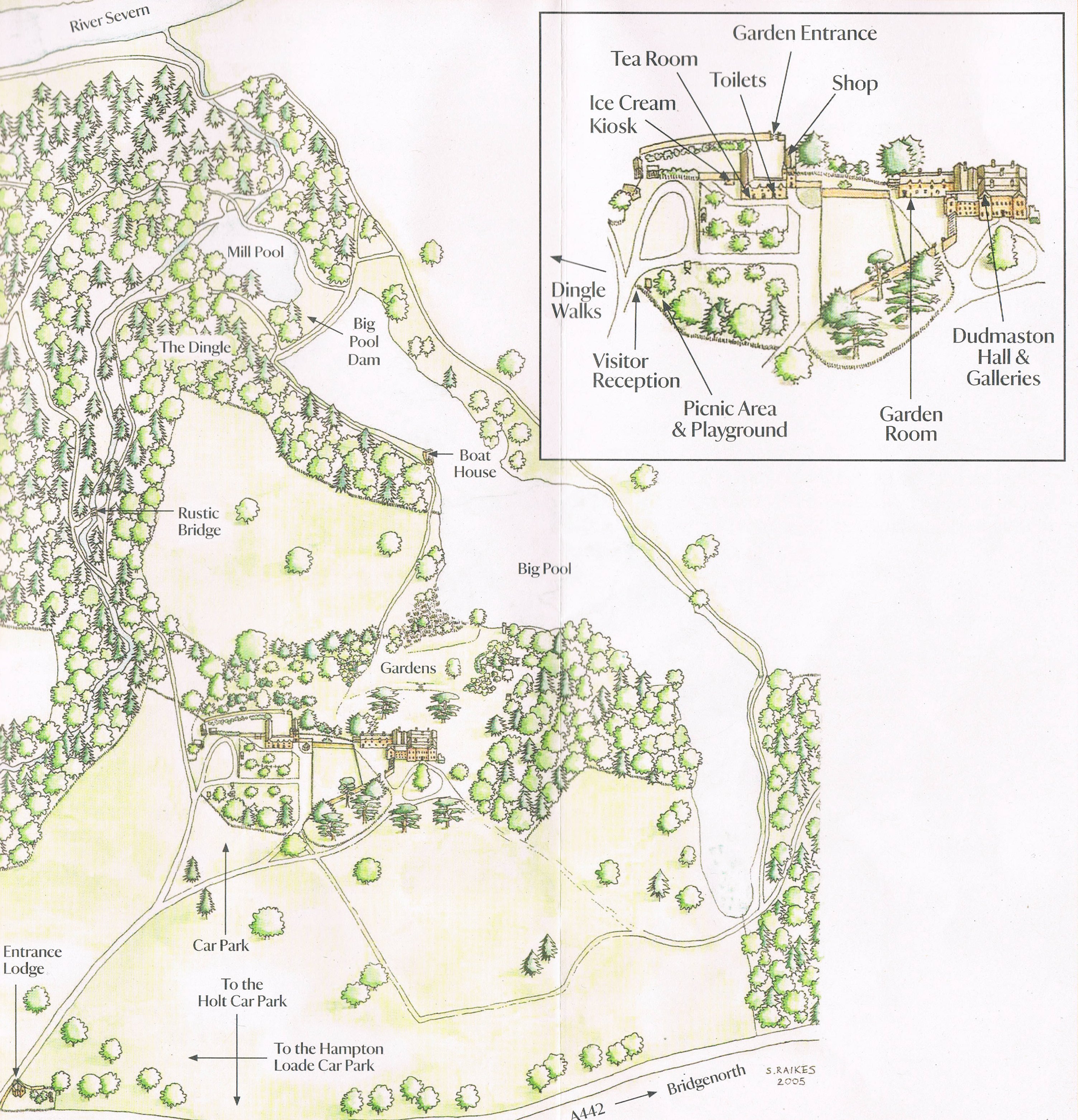 The gardens at Dudmaston are nothing to write home about, but the estate and park are extensive with opportunities for long walks – which we took full advantage of. Starting from the car park we headed towards the Big Pool that you can see on the map below (click on it for a larger image), over the Rustic Bridge, round the Dingle, across the dam, and following the path to the River Severn. Coming out of the woods on to a west-facing slope above the river, we could see the track of the Severn Valley Railway (a heritage line) on the other side. It would have been a great spot to watch the steam trains. But none came by, but once we’d headed back along the lake, we did hear a couple of locomotives whistling in the distance.