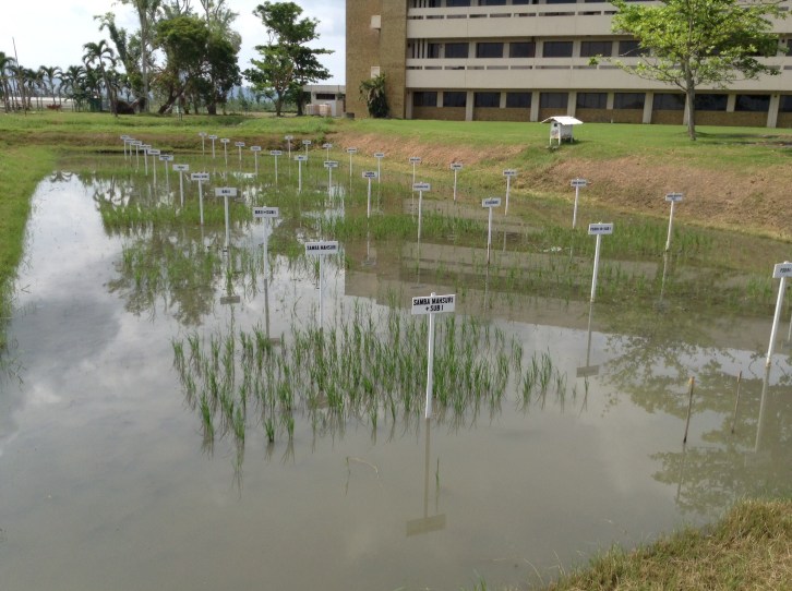 Submergence tolerant rice varieties, showing variants with the SUB1 gene after a period of flooding – these are the green plants