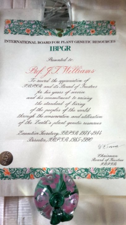 Certificate of Appreciation from IBPGR Board when Trevor stepped down in 1990