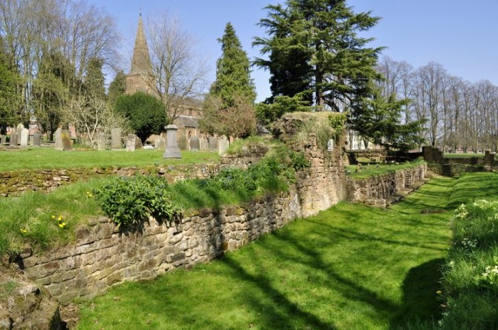 The cloister, along the outside of the nave. The wall is constructed from various pieces of masonry, some elaborated carved.
