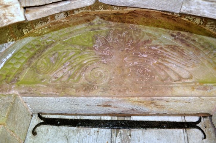 The Tree of Life carved into the stonework above the church door.