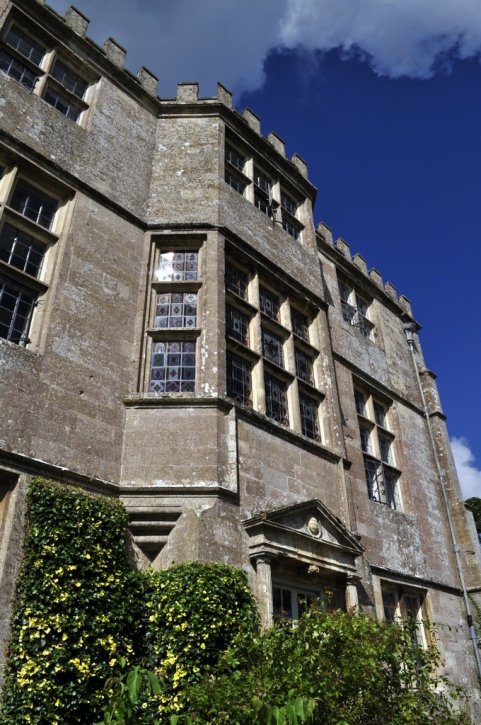 The bow window of the east face that has the wonderful stained glass and coat of arms of the Clutterbuck family.