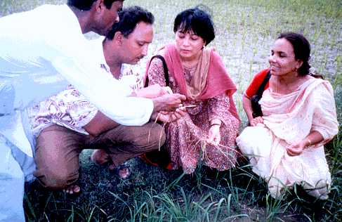 Dr Thelma Paris, former gender specialist at IRRI, discusses production constraints with farmers and researchers.