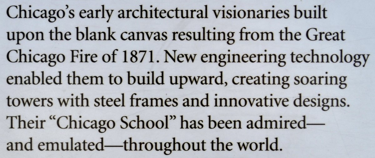 Since we had already made a 2,300 mile road trip around Scotland and the Western Isles at the end of May-early June, I didn’t fancy another long drive. But a short break in Chicago seemed to fit in well with our schedule. And, after all, Chicago is one of the great US cities that has to be in your travel plans at some stage. Until we visited I hadn’t heard about the Great Fire of Chicago in October 1871 when several square miles of the city were destroyed. But this also gave an opportunity to build a better city, and upwards.