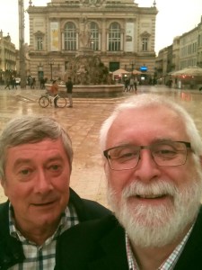 But were we ‘three sheets to the wind’, as Gene cheekily described us? Well, we were certainly merry after a couple of beers (and a couple of small ones earlier in the hotel bar), a nice bottle of red Languedoc, followed by a couple of cognacs each. Brian looks particularly surprised because I dropped my walking stick and it hit the ground with a clatter just as I took that selfie.