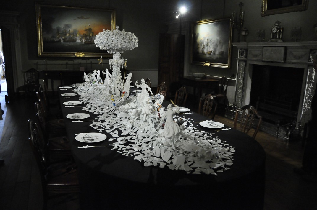 On this visit, the room was almost in darkness, with just spotlights focused on a sculpture, War & Pieces, that extended the length of the table. Created by Dutch artist, Bouke de Vries, this is how the sculpture is described in the National Trust brochure: