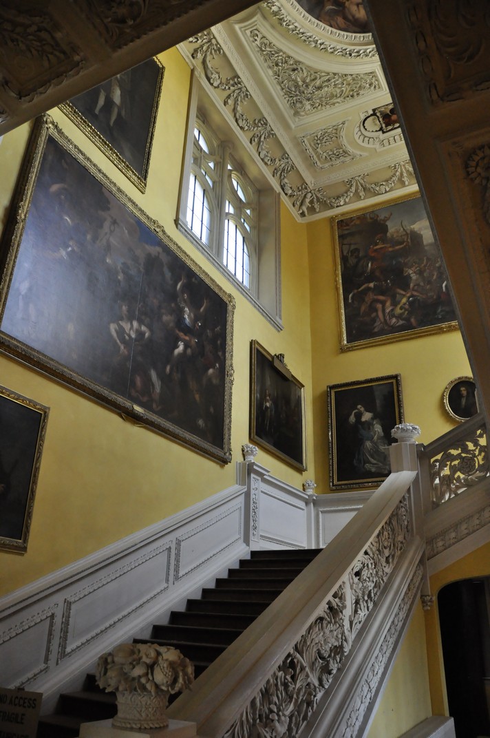 Leaving the Entrance Hall, nothing quite prepares you for the magnificence of the staircase, from floor to ceiling, with its intricate carving (apparently in lime wood, and painted white), the paintings on the walls, and the elaborately decorated ceiling. It must rank as one of the most impressive that we have seen in any of our National Trust visits.