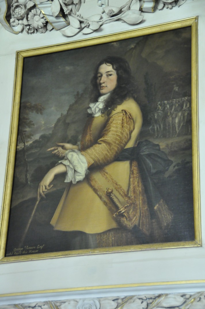 In the Saloon, family portraits are set in panels carved by Edward Pierce (or Pearce), who also carved the balustrade on the magnificent Great Staircase. The ceiling panel in the saloon and elsewhere are paintings by Louis Laguerre in the Baroque style, which were commissioned by George Vernon a couple of decades later.