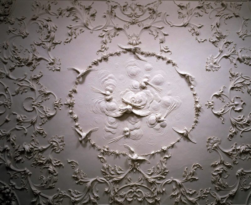 Detail of the ceiling at Florence Court in the Dining Room.This is the most elaborate ceiling in the house and survived the 1955 fire. The centre shows an eagle surrounded by the four winds.