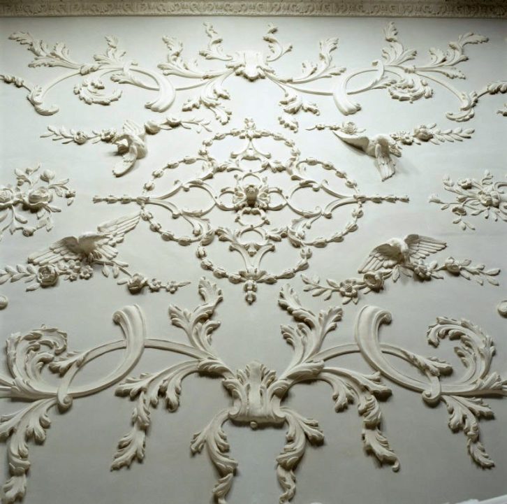 Detail of the ceiling in the Venetian Room at Florence Court. This ceiling decoration was restored after the 1955 fire and shows a mixture of birds, flowers and leaves.
