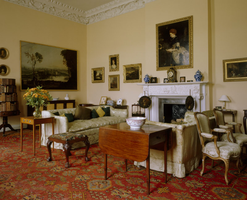 Drawing Room at Florence Court. The chimneypiece is neoclassical Carrara marble with Ionic columns & elaborate frieze. The room is filled with Enniskillen family portraits and furnishings.