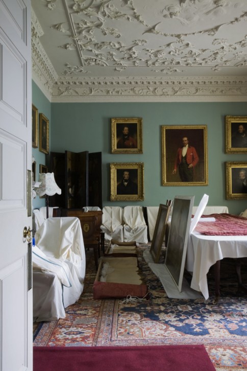 The Dining Room with dust covers over the chairs and table, and paintings off the wall, during the winter months of housekeeping at Florence Court, Co. Fermanagh, Northern Ireland.