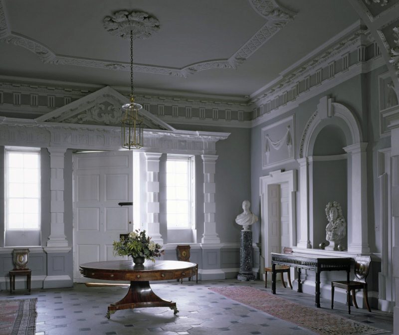 The Entrance Hall at Florence Court looking towards the door with its tripartite doorcase. An entablature with a frieze of triglyphs runs around the hall with rusticated Doric pillars.