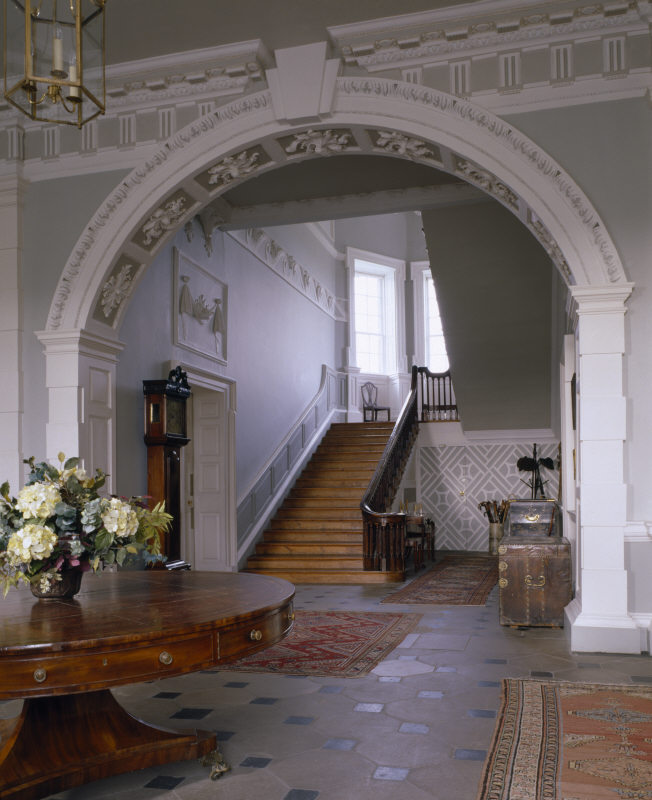 View of the Entrance Hall at Florence Court looking towards the cantilevered staircase. An entablature with a frieze of triglyphs run around the hall, supported by rusticated Doric Pillars.
