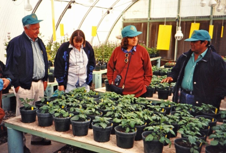 Don Byth (ICRISAT), Jean Hanson (ILRI) and Jane Toll (SGRP) listen intently to Zosimo Huaman, genebnak curator at CIP in Huancayo