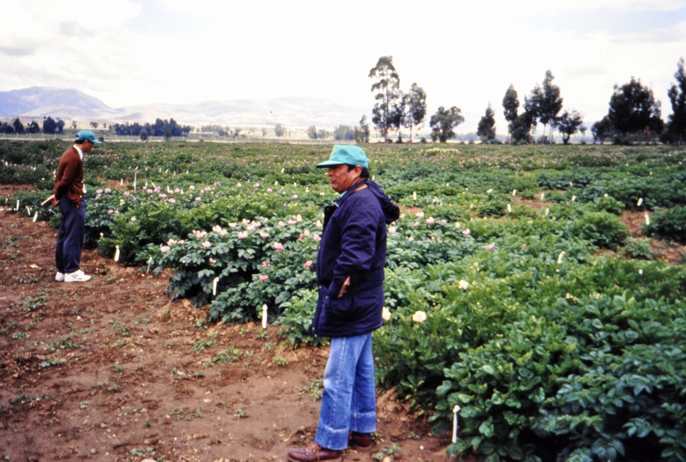 In the field looking at cultivated potato landrace varieties. Quat Ng (IITA) on the left.