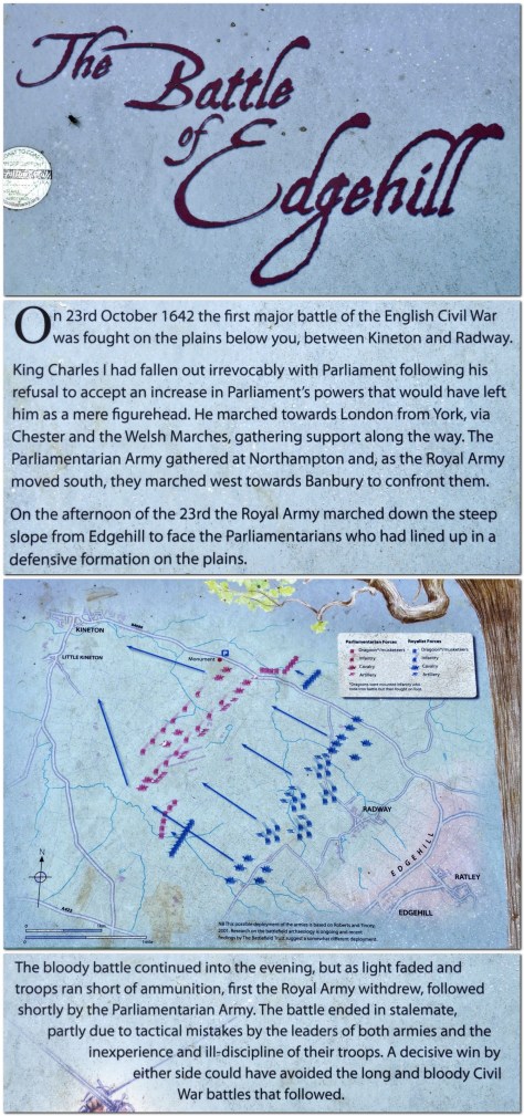 Edgehill was the site of the first major battle of the First English Civil War, on Sunday 23 October 1642. Here the Royalist supporters of King Charles I clashed with Parliamentary forces under the Earl of Essex. The King had commanded the high ground and his troops marched down the Cotswolds escarpment to join battle with the enemy, arrayed below. The battle ended in stalemate.