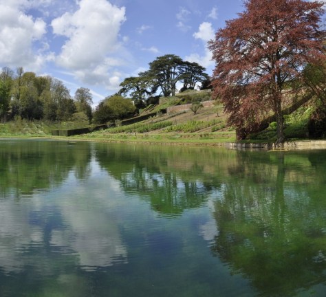 Looking west across the Mirror Pool to a magnificent yew behind the Kitchen Garden and the Dry Banks above.