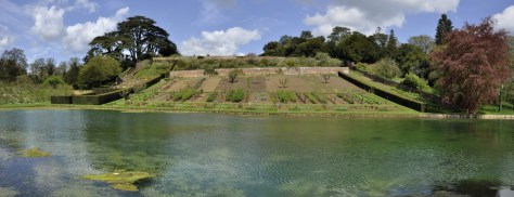 A panorama of the Kitchen Garden and Dry Banks across the Mirror Pool, from the south. The ha-ha is at the top of the terraces, immediately below the Main Lawn.