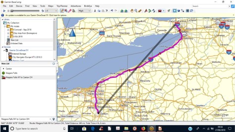 In BaseCamp I found the easiest way to plot a route was to choose the starting and destination waypoints, and let the software ‘find’ the optimum route. In this example below, I plotted a route from Niagara Falls NY to Canton OH, which was the third day of our recent trip after leaving Maine.