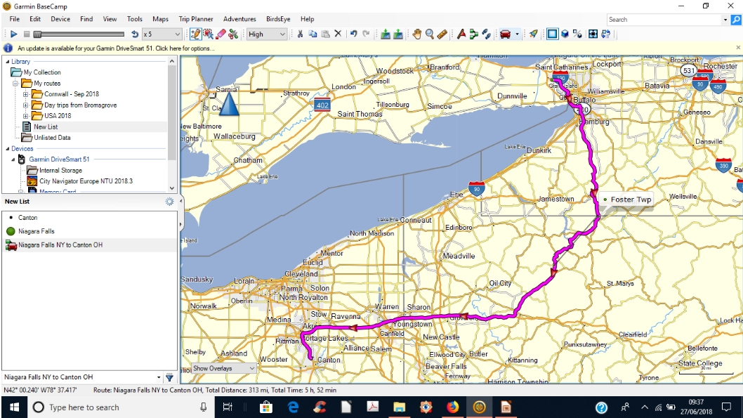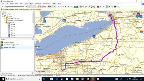 In BaseCamp I found the easiest way to plot a route was to choose the starting and destination waypoints, and let the software ‘find’ the optimum route. In this example below, I plotted a route from Niagara Falls NY to Canton OH, which was the third day of our recent trip after leaving Maine.