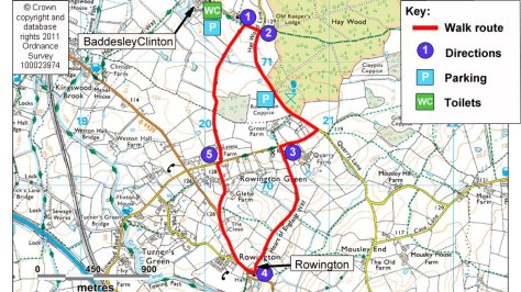 We set off through the churchyard of St Michael’s Church (1), and along the gravel road to turn right (2) on to Haywood Lane, and then, after about a mile, right on to Rowington Green.