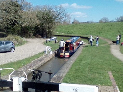 A narrowboat passes through the lock below Tardebigge Reservoir (that supplies water to the canal). From here, this walk takes me west towards home.