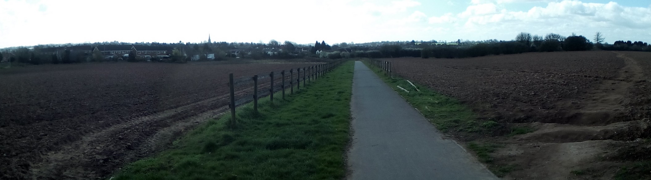 This the public bridleway connecting Perryfields Road with Crabmill Lane. The fields either side were sown with barley in 2018. The spire of St John’s Church can be seen on the horizon, left of center.