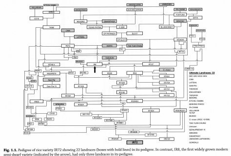 Just take this example from rice, showing the pedigree of the variety IR72 that was released in 1990. Many landrace varieties were crossed to produce this variety. But also very importantly, a wild rice, O. nivara (a close relative of O. sativa with which it crosses easily, and in the same genepool – see diagram below) was the source of resistance to grassy stunt virus, and it was this resistance that made IR72 such a successful variety.
