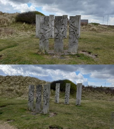Along the path, about halfway between Blyth and our car park, there’s an interesting sculpture, in wood, dedicated to cycling (the Eve Black Way carries part of the National Cycle Network route 1—Coast and Castles route—that is also part of the European Cycle Network North Sea route.
