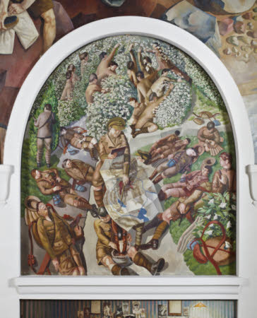 Oil painting on canvas, Map Reading by Sir Stanley Spencer, CBE, RA (Cookham 1891? Cliveden 1959), 1927/32. This scene which featured in the original 1923 sketches, shows soldiers taking a rest whilst in route-march, whilst the only officer in the whole scheme of paintings is depicted studding a large map from the back of his horse. Around him soldiers sleep upon the grass and harvest bilberries from the landscape. The bright, distinct flora along the roadside is analogous to that of `Convoy of Wounded?, a painting with which an elevated view point is also shared.