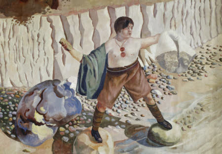 Oil painting on canvas, Riverbed at Todorovo, by Sir Stanley Spencer, CBE, RA (Cookham 1891? Cliveden 1959), 1930-1. The canvas runs along the top of the south wall showing soldiers, likely the 143rd Field Ambulance, RAMC, at recreation.The badges of the RAMC and the Berkshire Regiment (which Spencer later transferred to) are being made by a group of soldiers, whilst in the foreground men wash their clothes in the river. Aspects of the painting were established in the earlier paintings `Making a Red Cross? and `Scrubbing Clothes?.