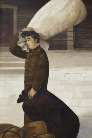 Oil painting on canvas, Sorting and Moving Kitbags by Sir Stanley Spencer, CBE, RA (Cookham 1891? Cliveden 1959), 1927. Painted in Henry Lamb’s studio in Hampstead before the artist moved to Burghclere to work in the Chapel itself, the scene depicts a newly-arrived convoy in the background pointing out their kitbags to the hospital orderlies, who then would deliver the bags too the patients in their wards. The drab and limited range of colours, and the stark architecture again help to evoke a cold, cheerless institutional scene. Exhibited at Stanley Spencer’s first solo exhibition at the Goupil Gallery, London, in March 1927.