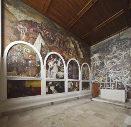 The north wall paintings, and altar and east wall with THE RESURRECTION OF THE SOLDIERS by Stanley Spencer (1891- 1959) at Sandham Memorial Chapel, Burghclere, Hampshire. Artist’s work in copyright – further permission required