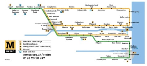 Trains from South Shields (yellow line) head into Newcastle city center, before turning east to Whitley Bay and Tynemouth on the North Sea coast and looping back to the St James terminus.