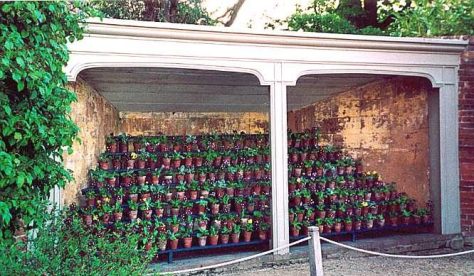 In the 18th century, growing auriculas became quite a fad, and so-called auricula theaters were built to display them at their best. There is a particularly impressive auricula theater at Calke Abbey in Derbyshire, but was full of pelargoniums, not auriculas, as shown below when we visited in 2012.