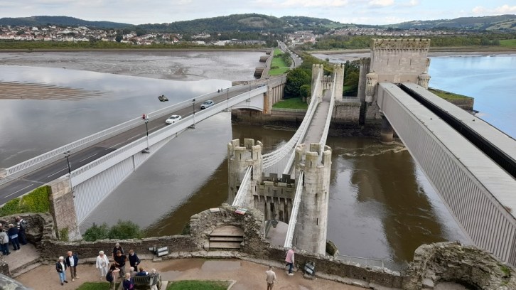 The three Conwy bridges from Conwy Castle.