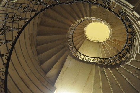 Either side of the entrance hall are quite spectacular spiral staircases which provide access to a first floor balcony from which to observe the destruction of the fire two centuries ago.