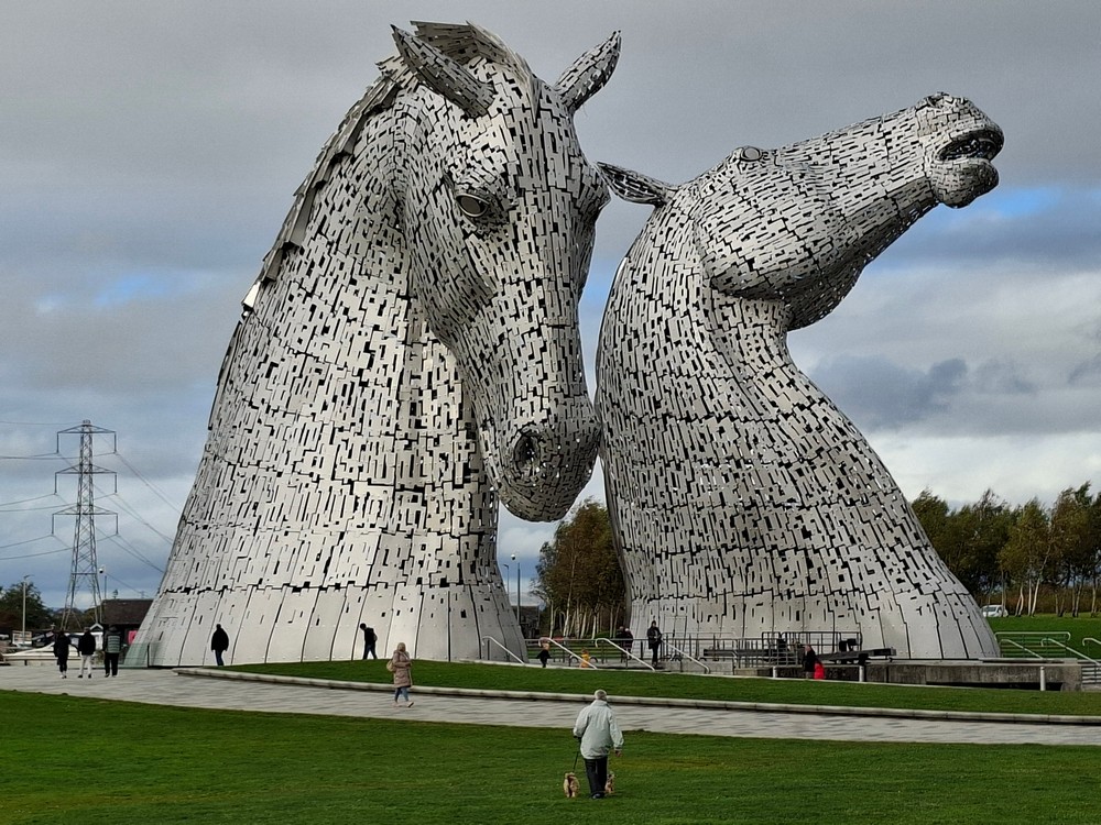 After lunch, we headed a few miles southwest from Stirling to visit a landscape feature we’ve passed by at high speed on the M9 motorway on a couple of previous occasions. The Kelpies, mythical water horses, 30 m (100 foot) tall horses heads. Very impressive indeed!