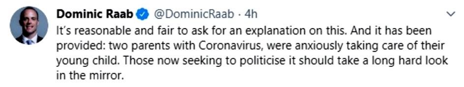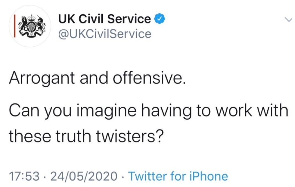It’s remarkable how quickly the condemnation of both Johnson and Cummings spread on social media, including from some Conservative MPs. And an anonymous civil servant who, having access to the Civil Service’s official Twitter account, posted this . . .