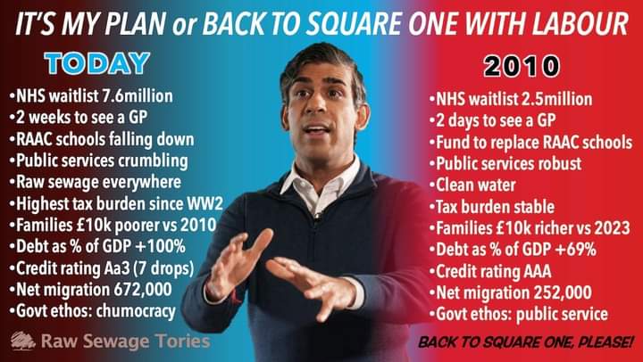 Just compare how Labour left the nation in 2010 when David Cameron led the Tories to victory in the General Election (propped up by the Liberal Democrats in coalition), to what the situation is currently under Rishi Sunak, or as I prefer to refer to him as ‘Rish! Pipsqueak‘ (the fifth Prime Minister since 2010).