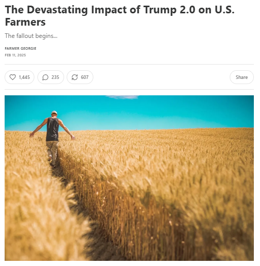 Those cuts at USAid immediately affected humanitarian, health, and agricultural support programs around the world, as personnel were recalled to the US (I have a number of close friends who worked for USAid in the US or abroad), and an immediate ban on further program expenditures implemented. But it’s not just overseas that USAid’s demise will be felt. USAid was a huge purchaser of home-grown grains for donation to the World Food Program or directly to nations suffering food shortages. US farmers will reap the harvest of Musk’s misguided ‘efficiencies’.