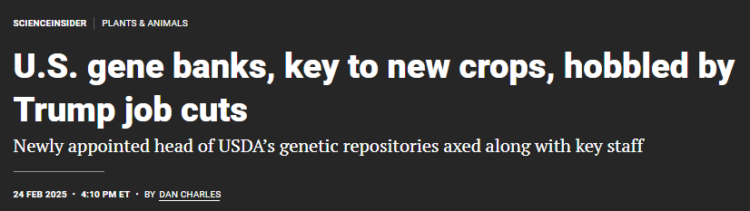 The other area of concern with regard to the Trump/Musk attack on federal agencies relates to the long-term safety of the nation’s genetic resources collections managed by the United States Department of Agriculture (USDA).