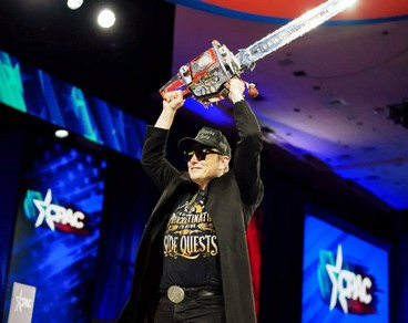 Elon Musk wielding a chainsaw at the Conservative Political Action Conference (CPAC) at the Gaylord National Resort Hotel And Convention Center on 20 February 2025 in Oxon Hill, Maryland.