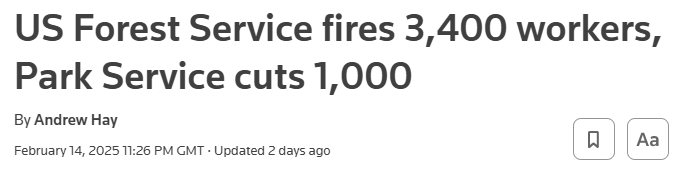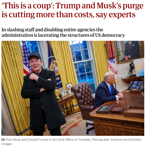 That’s not to deny that inefficiencies can be found and budgetary savings made in any government, and I’m sure the US federal government is no different from any other. But to proceed, as Musk and his acolytes have, is causing possibly irreparable damage on a daily basis, thousands of federal employees are losing their jobs, and this ‘downsizing’ has been effected in, it seems, an indiscriminate way. Last in, first out, and hang the consequences.