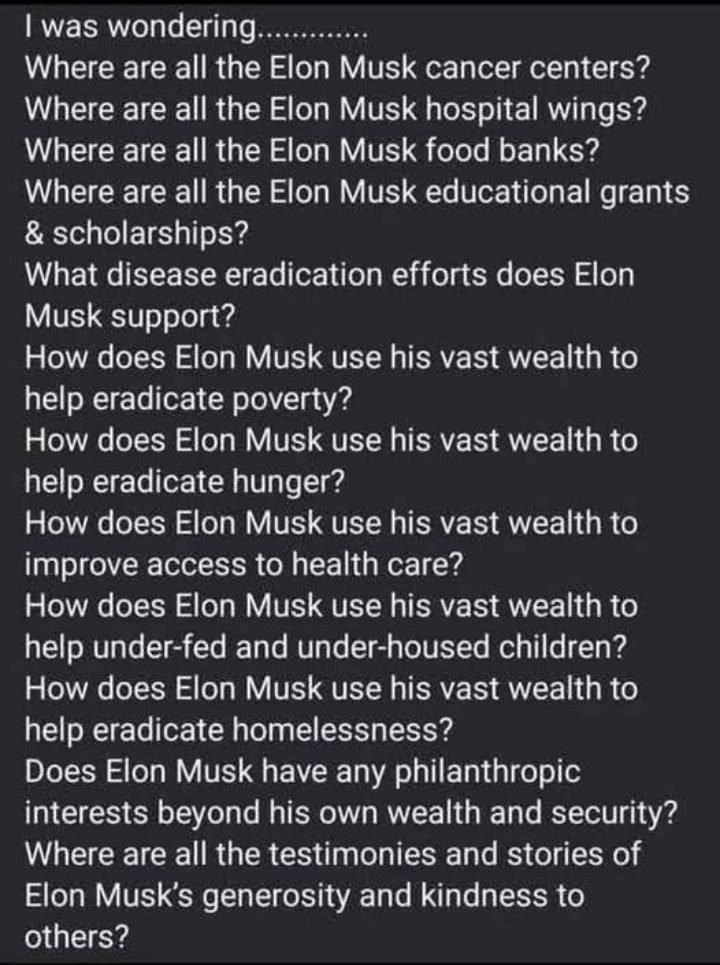 Says so much. Just to put Musk’s wealth into perspective. If he was to give away USD1 million a day, it would take over 1000 years to disburse the lot! As far as anyone can tell, Musk has not engaged in any (or very little – I stand to be corrected) philanthropic endeavours.