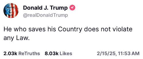 The blatantly illegal actions he has already taken through a mountain of Executive Orders are being challenged in the courts. But will Trump obey court orders? It seems not, if we take him at his word in a comment posted on 15 February on Truth Social. What a dangerous attitude and precedent!
