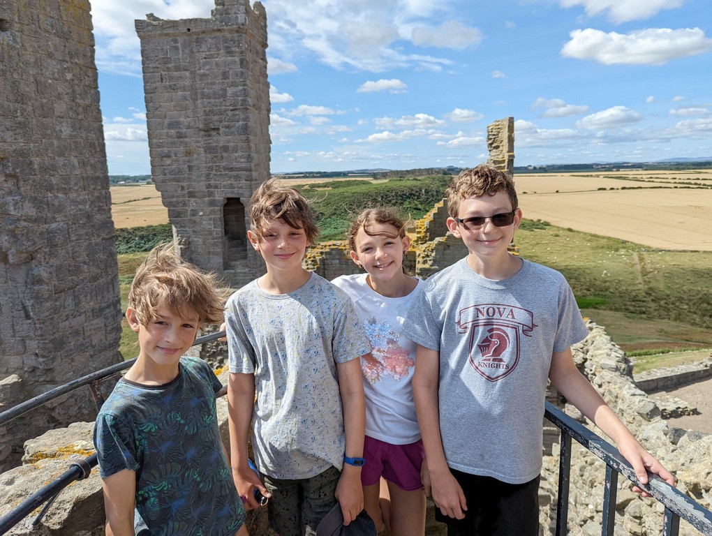 L-R: Felix, Elvis, Zoë, and Callum, at Dunstanburgh Castle, Northumberland in August 2022.